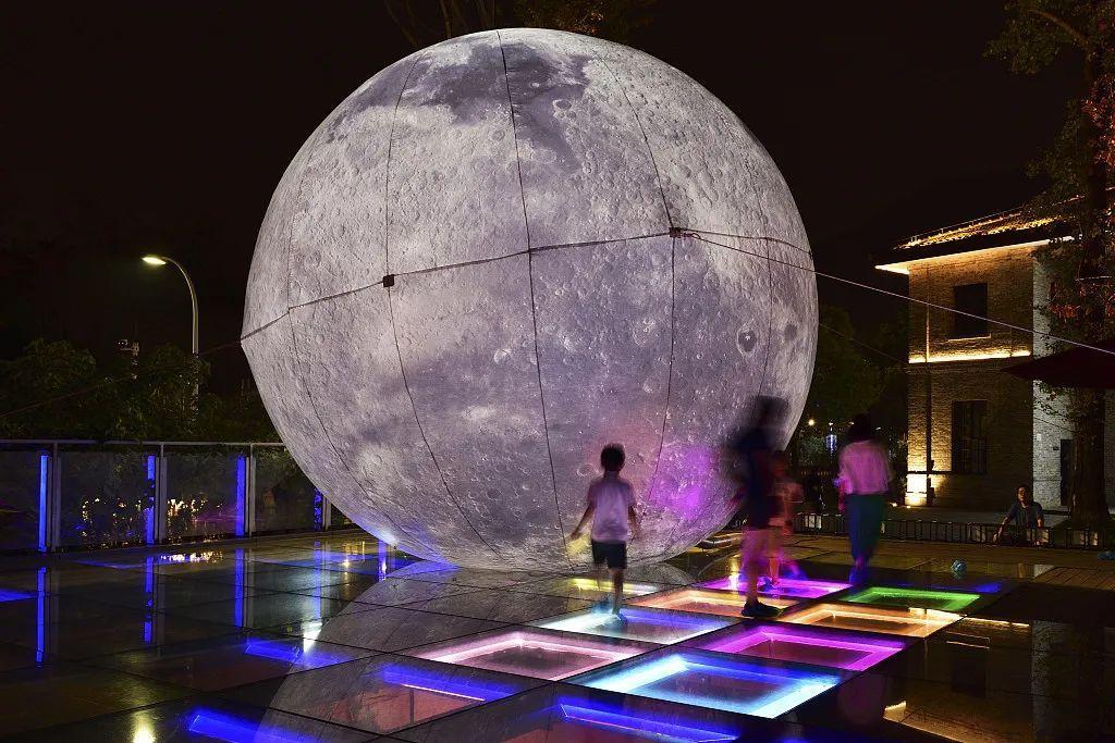 2022年9月11日,重庆,南岸区龙门浩老街在星光观景台出现了一个巨大的超级大“月亮”,该“月亮”直径为12米,是名副其实的“大月亮”。采用牛津面料制做而成。在星光观景平台上,随着游客的行走,玻璃感应系统自动开启五彩灯光,在闪耀星空的氛围下,巨型月亮看起来更是动人。吸引众多市民、游客前来拍照打卡迎中秋。/ CFP