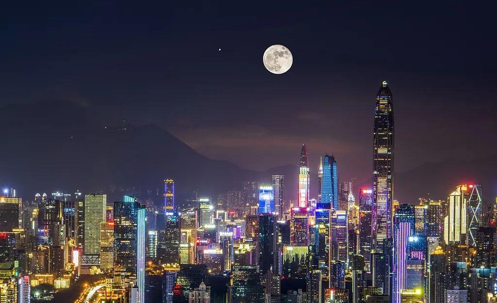 2022年9月11日,深圳,农历八月十六,夜空现“木星合月”景观。/ CFP