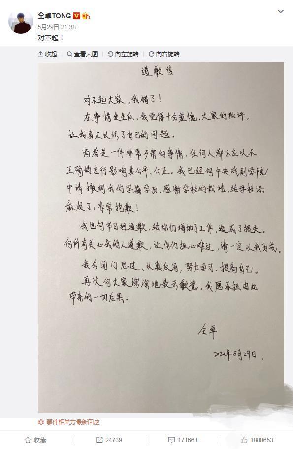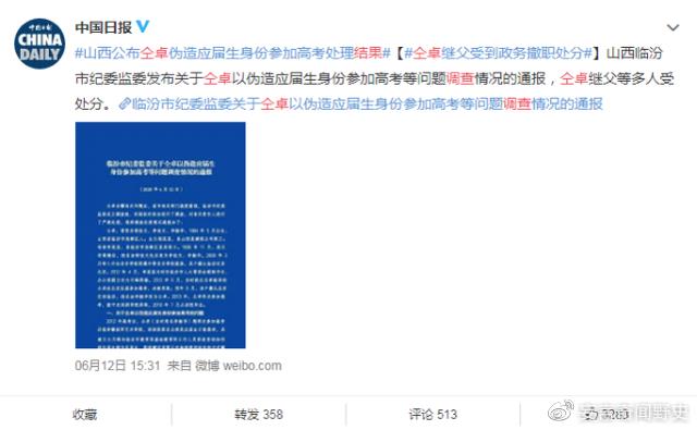 6月12日,山西省教育厅通报仝卓高考舞弊案:违反有关规定,各科成绩无效。