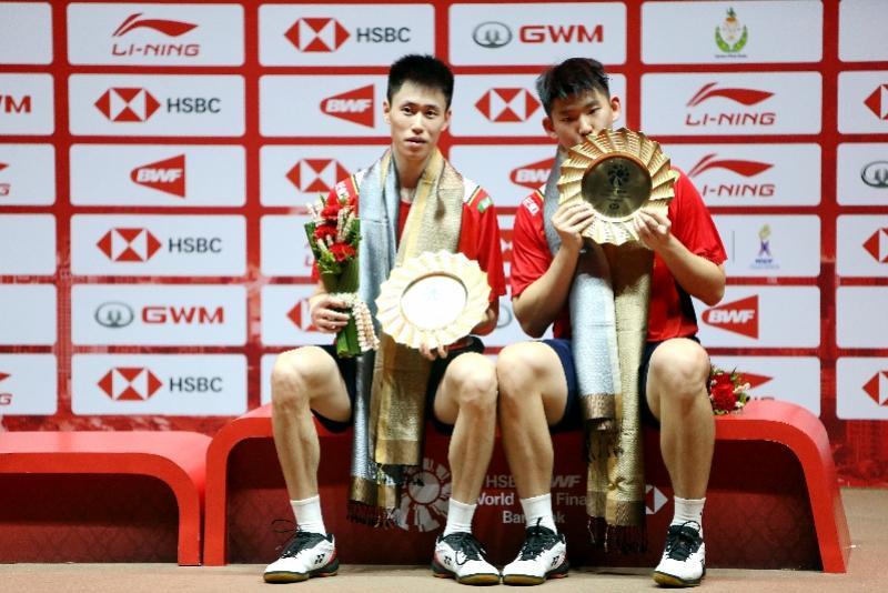新华社照片,曼谷,2022年12月11日 (体育)(1)羽毛球——世界巡回赛总决赛:刘雨辰/欧烜屹男双夺冠 12月11日,中国组合刘雨辰(右)/欧烜屹在颁奖仪式上。 当日,在泰国曼谷举行的2022世界羽联世界巡回赛总决赛男双决赛中,中国组合刘雨辰/欧烜屹以2比1战胜印度尼西亚组合阿山/亨德拉,获得冠军。 新华社记者 王腾 摄