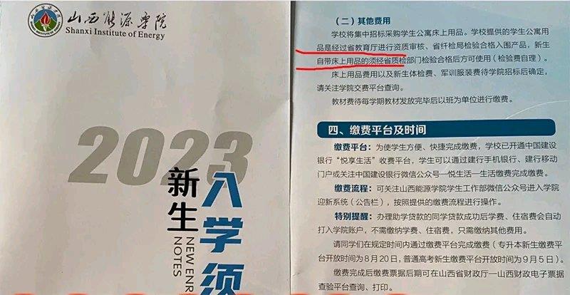 据悉,在山西能源学院2023年新生入学须知上,特别提到了“其他费用”,其中明确表示学校将集中招标采购学生公寓床上用品,并强调学校提供的学生公寓用品经过省教育厅资质审核、省纤检局检验合格入围产品。同时,凡是自带床上用品的新生需要向学校登记,并由省质检部门随机抽查,只有检验合格才能使用,检验费由学生自行承担。