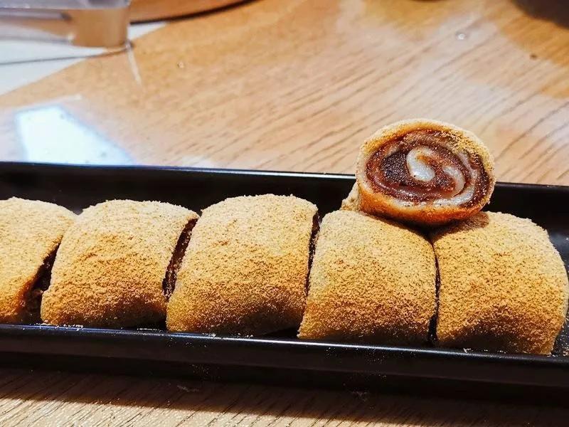 驴打滚是老北京传统小吃之一,制作时要求馅卷得均匀,层次分明,外表呈黄色,特点是香、甜、粘,有浓郁的黄豆粉香味儿。