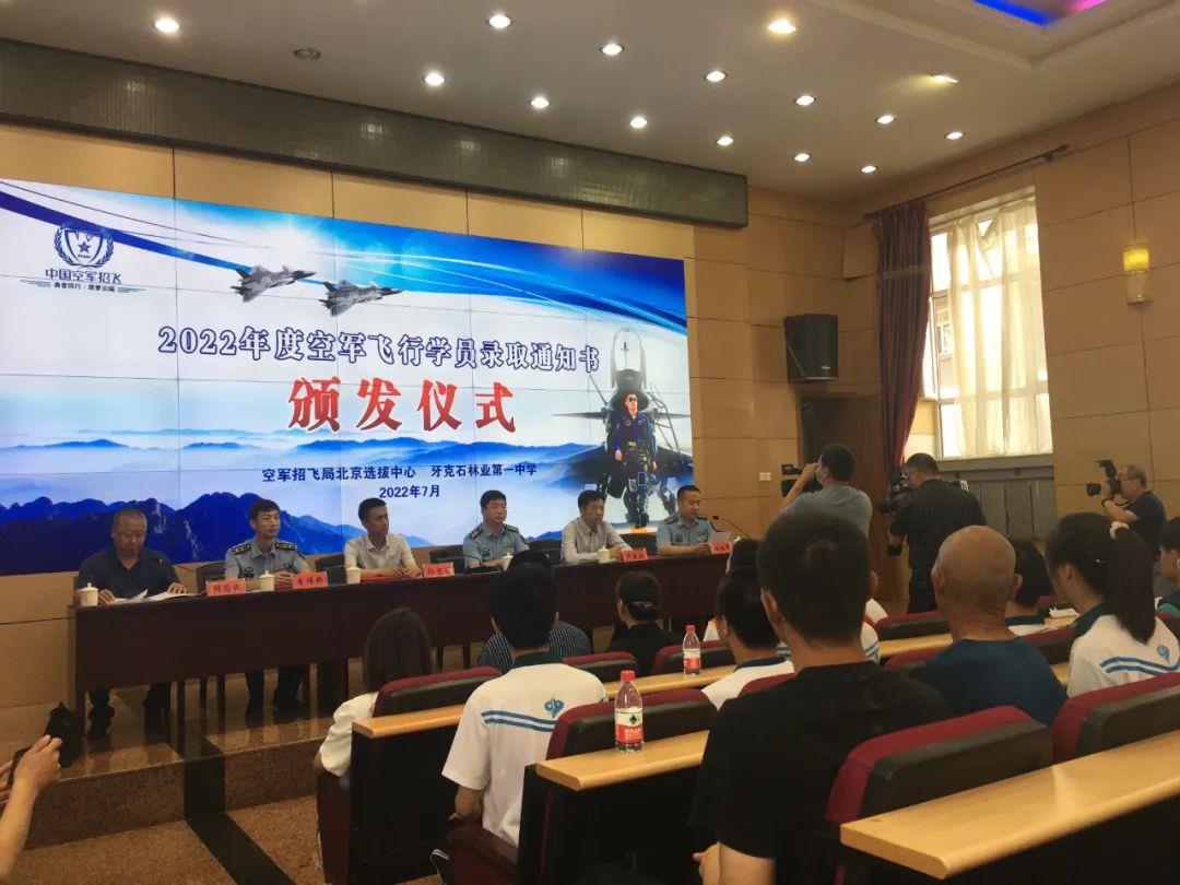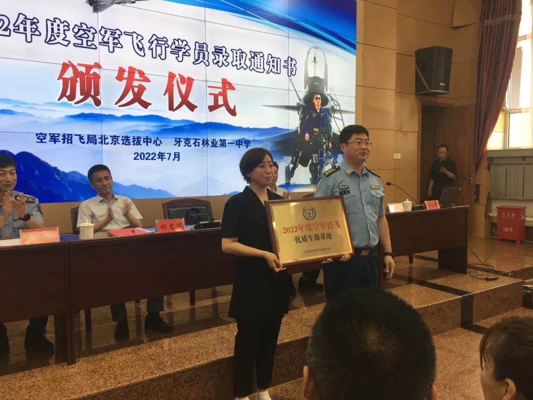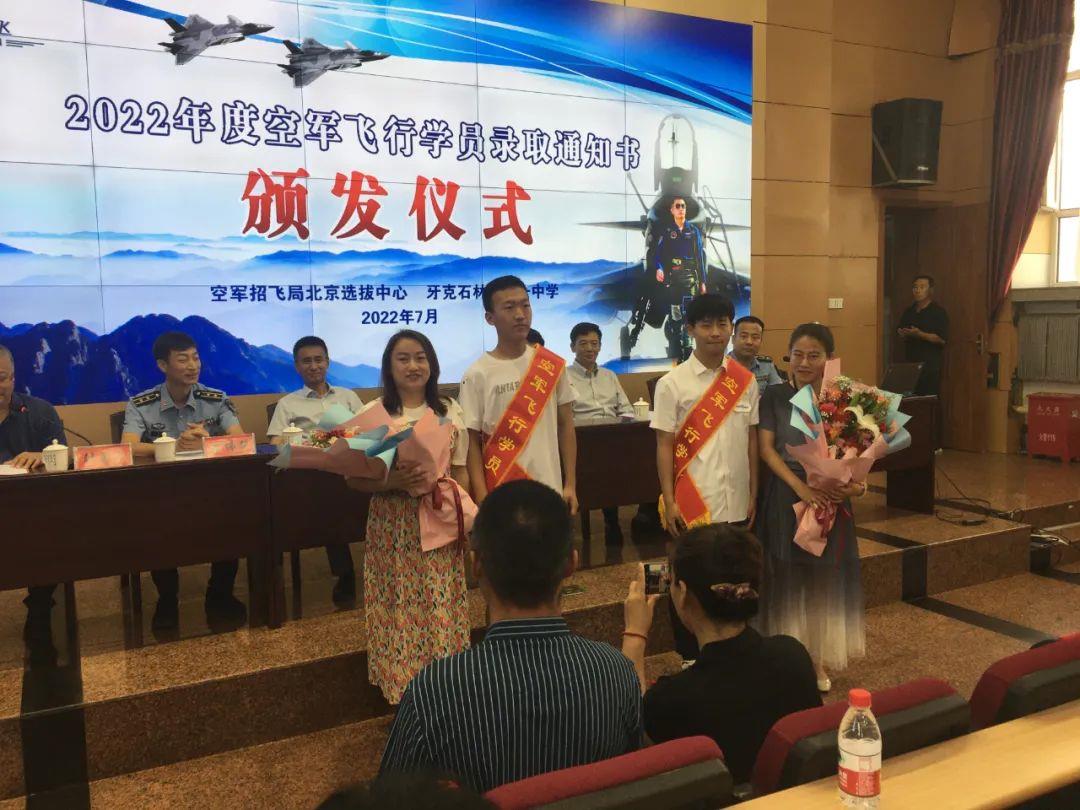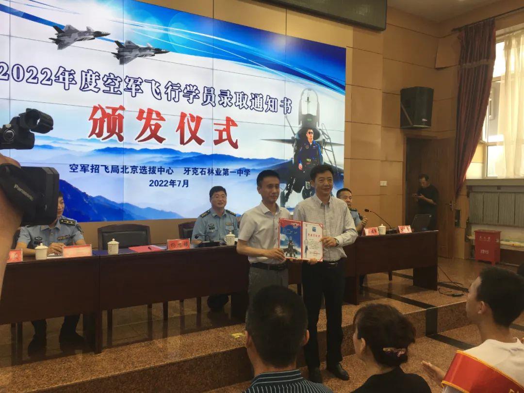 日前,牙克石林业第一中学2022届毕业生李绍祺、王礼明被中国人民解放军空军航空大学录取。在空军飞行学员录取通知书颁发仪式上,空军招飞局北京选拔中心、呼伦贝尔市教育局相关负责人为李绍祺、王礼明颁发飞行学员录取通知书、喜报和荣誉证书,还为录取学生班主任颁发了育鹰奖荣誉证书,为牙克石林业一中颁发优质生源基地牌匾和喜报,为牙克石林业一中校长颁发突出贡献奖。