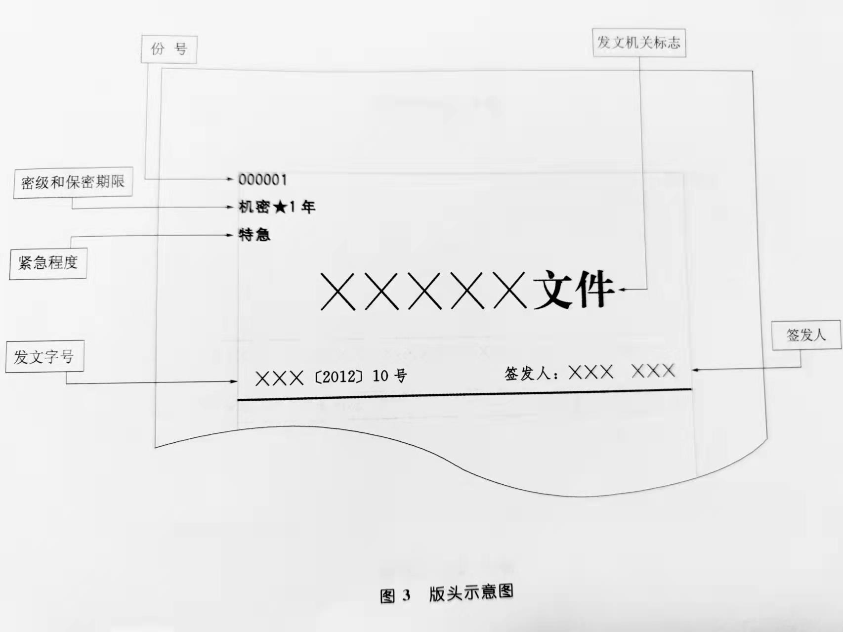 版头(6个要素):份号、密级和保密期限、紧急程度、发文机关标志、发文字号、签发人。