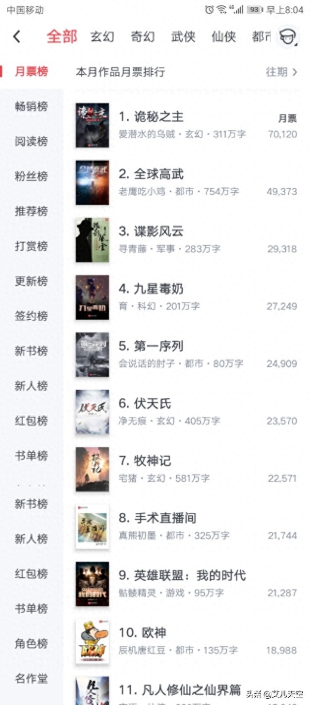★乌贼继续领跑风云榜,《诡秘之主》以超过两万余票的巨大优势继续占据头名。本月榜首毫无悬念。