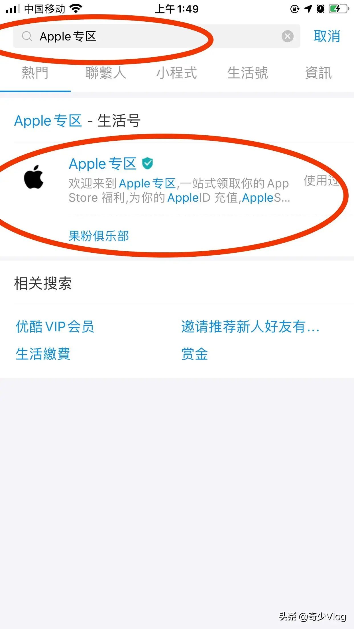 1.首先打开支付宝,搜索"Apple专区"并点击进入。