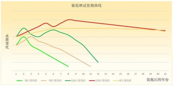 刚装瓶的葡萄酒,除了普通白葡萄酒适合直接喝,其他的都会随着保存时间发生变化,只是变化程度和曲线有区别,大体上如上图所示那样。当你买酒的时候可以参考这张图,可以帮助你挑选正在“适饮期”的葡萄酒。