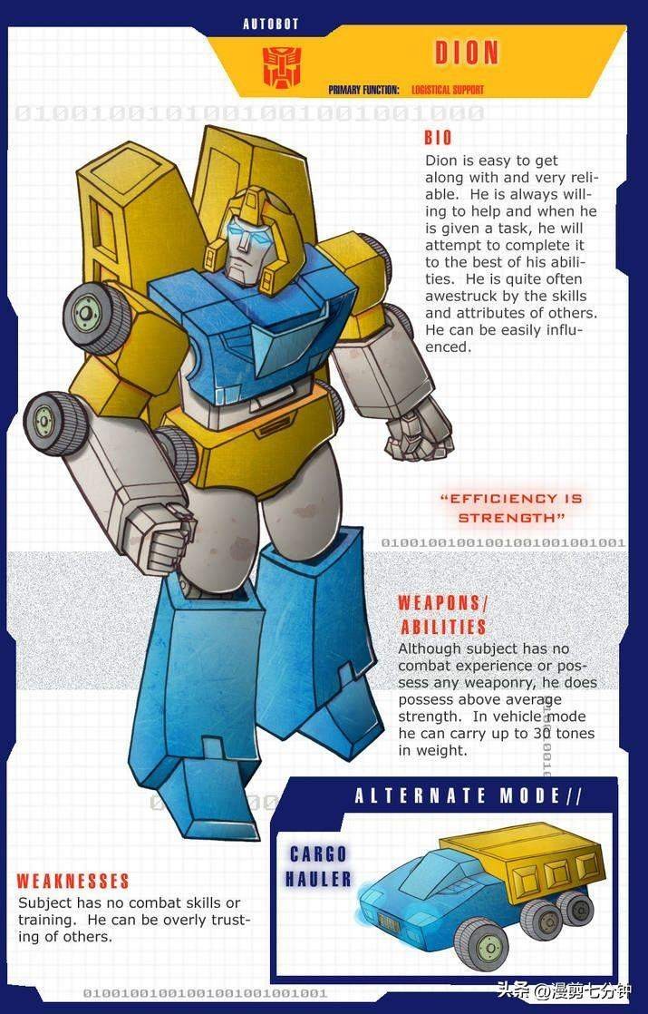 迪恩,英文名字Dion。准确的音译应该为迪翁。但是国内在引进变形金刚动画片时把他翻译为迪恩。不可否认的是这个名字叫起来会更顺口。迪恩是美版G1故事中的一名汽车人,它是一位心地善良,工作认真的库管工人。同时它又是奥利安派克斯最好的朋友。它的生活方式及其简单,是名纯粹的体力劳动者。面对硝烟四起的大环境,它很难感受到战争的火焰。它和好朋友奥利安最大的兴趣就是研究那些可以在天上飞行的机器人。