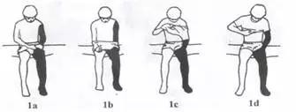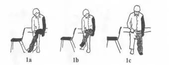 1.患者坐于床边或椅上,偏瘫腿屈跷于健腿上,用健手抓住裤腰并使偏瘫腿套入相应的裤管。