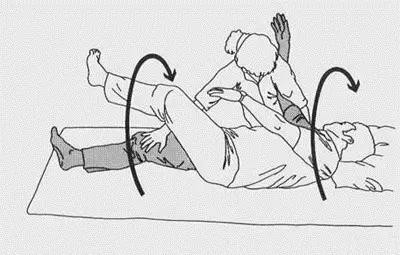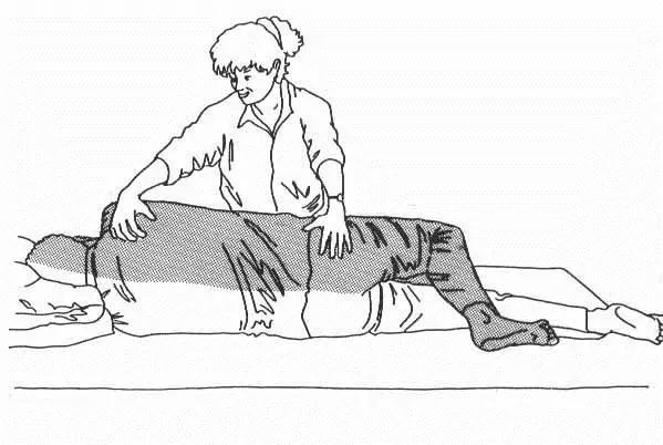 首先将患者的偏瘫侧上肢向床边打开,并伸直其肘部与腕部,用一手掌压住偏瘫侧上肢的手掌,然后,再用另一手拉住患者的健手,即可帮助患者翻向偏瘫侧。