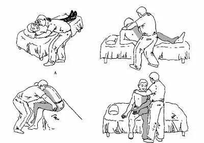 3.帮助患者用健腿将患腿带至床边、垂下,并用健侧上肢支撑上身至坐位。