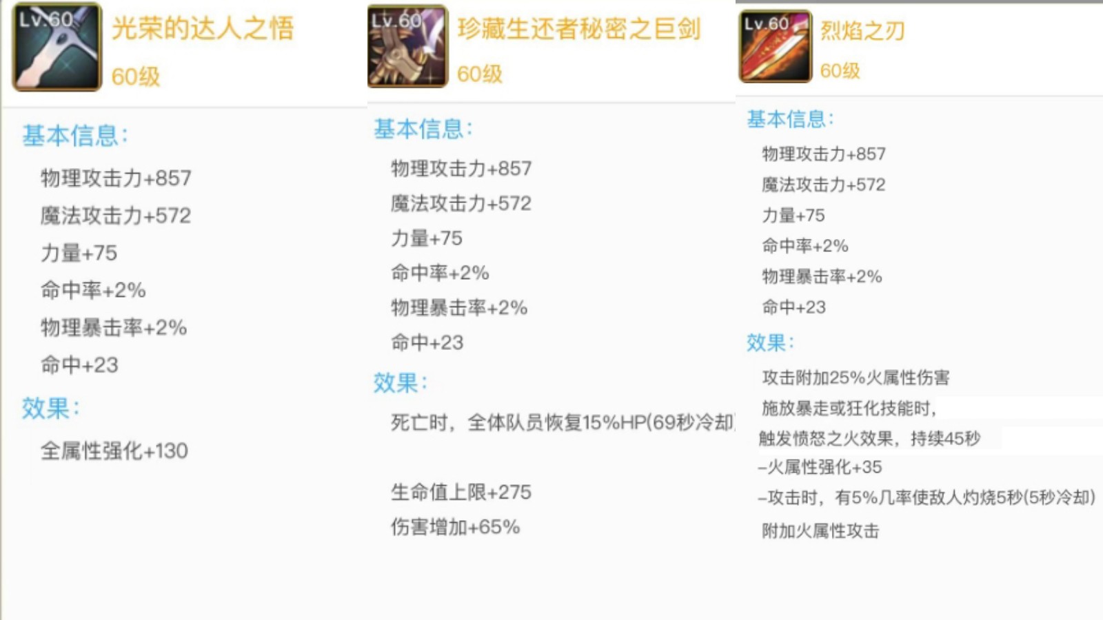 三把巨剑风格迥异,从面板上来看火刀可能是最差的,但是经过韩服实测火刀却是最强的。原因是,另外两把属性强化和黄字都会遭到稀释,火刀虽然也有稀释,但是影响较小。