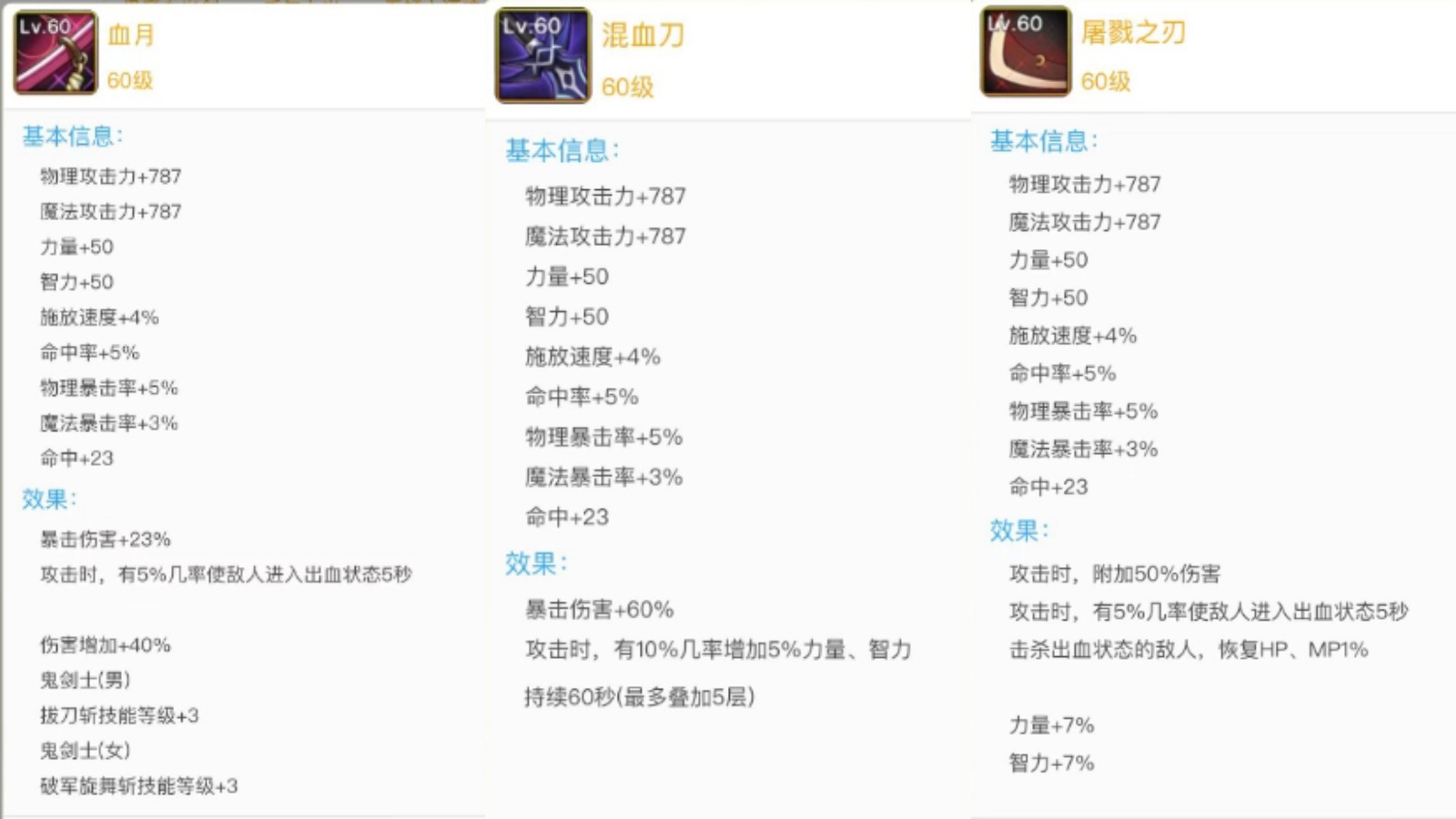 60版本ss太刀有三把,从属性来来看屠戮之刃比另外两把要强,但是如果60版本暴伤能够堆满,混血刀的优势就能显现出来了,血月这把太刀属性比较均衡,但是往往均衡的武器都不太能受到青睐。