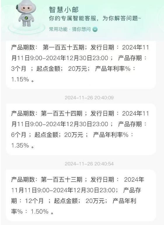 大芒芒的邮政银行储蓄卡很久没用过了,也没有绑定邮政银行手机APP,无法查看大额存单专区的产品,不过通过“人工客服”获取到了最新的大额存单产品情况,具体如下: