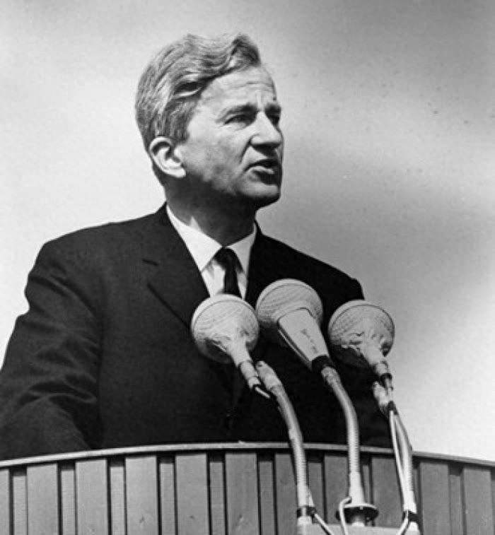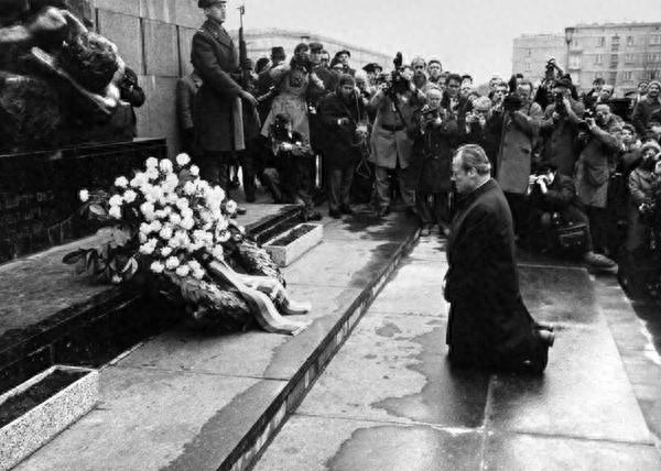 1970年12月7日,西德总理威利·勃兰特在波兰首都华沙向犹太人殉难者纪念碑双膝下跪,以代表德国向对被纳粹残杀的50万犹太人表示哀悼和忏悔。勃兰特在华沙的这“惊世一跪”引起了国际上的惊叹,当时媒体纷纷称赞道“跪下去的是勃兰特的双腿,站起来的是整个德意志民族的精神”。