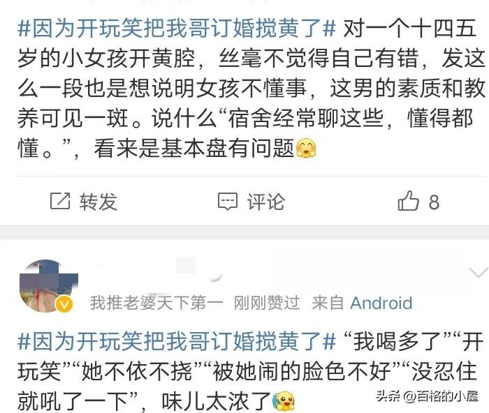6月4日,一则“因为开玩笑把我哥订婚搅黄了”的话题上了热搜,打开一看,让人火冒三丈,这哪里是开玩笑,这明明是对高中学生开黄腔。