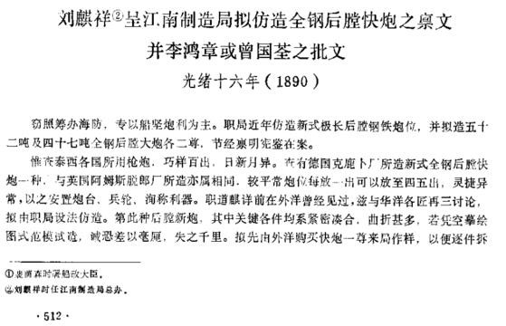 这是1890年,江南制造局总办刘麒祥,给李鸿章和曾国荃的批文,里面除了说要仿制52吨和47吨大炮各二门以外(这批是中国有史以来至今口径最大的重炮,回头改日说),还明白说明要设法仿造外洋新式速射炮,要先买一门样品回来试制~~说真的,我是很佩服我国这种“看一眼就怀孕”的山寨本事,一无图纸二无模板,买一门回来就能繁殖,这能力太牛了。