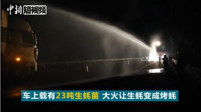 24日凌晨,南友高速广西南宁往崇左方向136公里处,一载有23吨生蚝苗的大货车突然着火,猛烈燃烧的大火让车上的生蚝变成烤蚝。