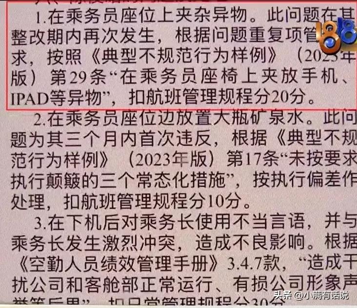 让她不解甚至气愤的是,东航对她的处理结果让她非常不满,她直接被扣掉30分,意味着丢掉了工作,而乘务长只被扣掉25分,依然在原来的岗位不变!空姐在视频中强调,公司处理结果相当不公平!
