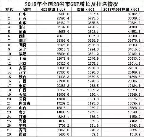 2018年各省GDP总量及人均GDP排名,广东逼近10万亿,福建增速领跑东部
