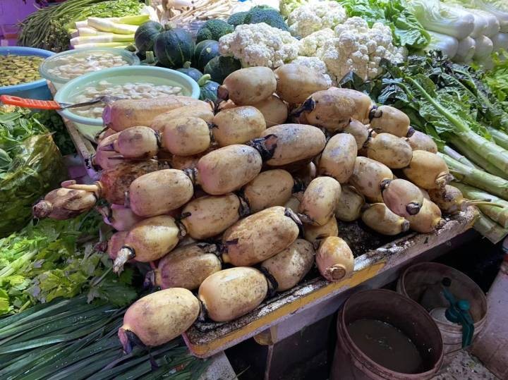 摊主大姐给客人简单教了一手,“你放在鱼香肉丝里炒也行,用来煮汤也行。它和笋不一样,吃起来是另一种滋味。”