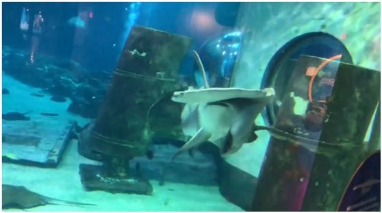 锤头鲨也叫双髻鲨,和我们平时认识的鲨鱼比起来,它的头部就像是大锤头,两边眼部和鼻孔分别向外垂直身体凸起一截。这奇特外形在鲨鱼中也只有上颚少了一块肉的魔鬼鲨可以和它一比。