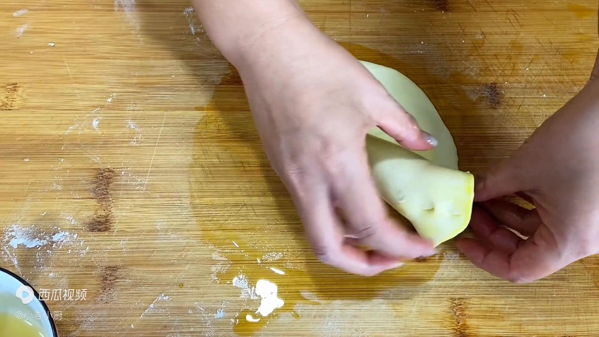·面片底部切上一刀,从一侧向另一侧慢慢的卷起来,边缘和底部收尾的位置稍微捏紧实一点,大头朝下竖过来整理一下,按扁,这样一个小饼坯就做好了。全部做好以后松弛10分钟。