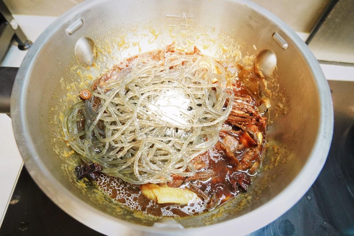 11、放入泡发好的榛蘑和煮软的粉条