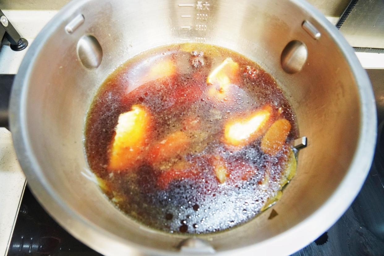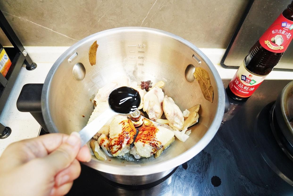 8、往烹饪锅里勺入生抽、老抽、蚝油和盐