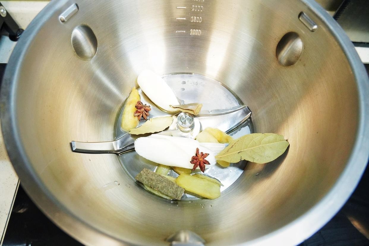 4、烹饪锅里放入植物油、大葱段、姜片、八角、香叶和桂皮