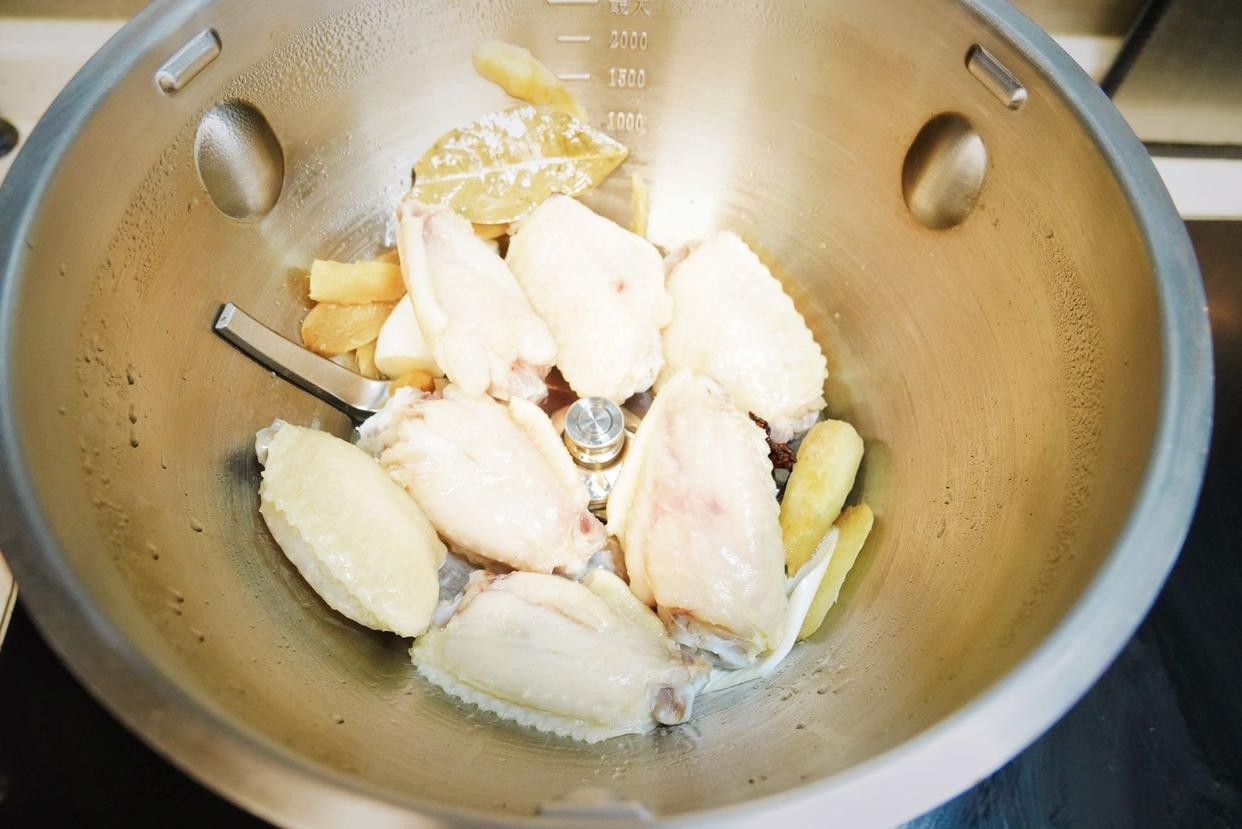 6、放入焯烫好的鸡中翅