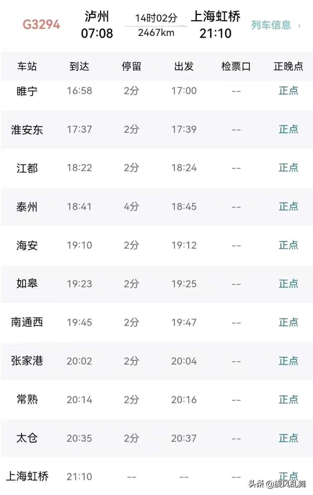 上海虹桥开往西安北G3291/4次延长到泸州,增加停靠停靠南通西站(19:45~19:47)。