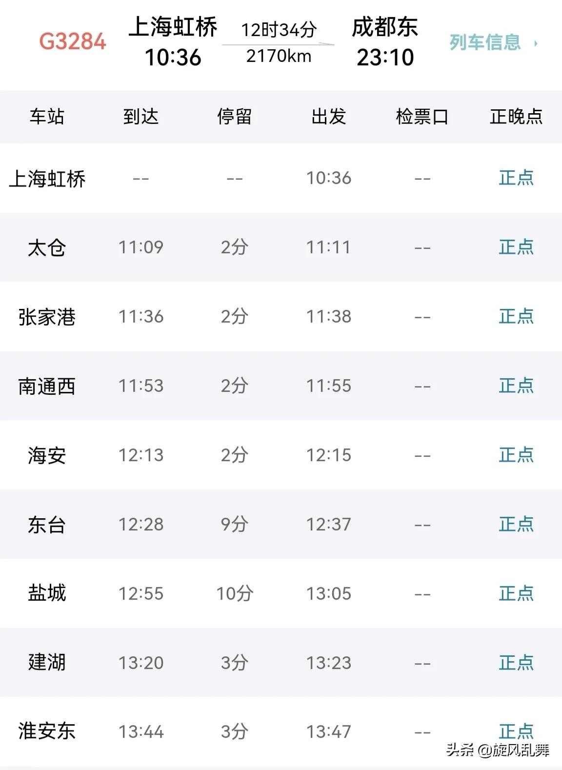 上海虹桥开往成都东的G3284次列车,增加停靠太仓、南通西(11:53~11:55)、海安、东台、建湖、宿迁,减去如皋南、盐城大丰。