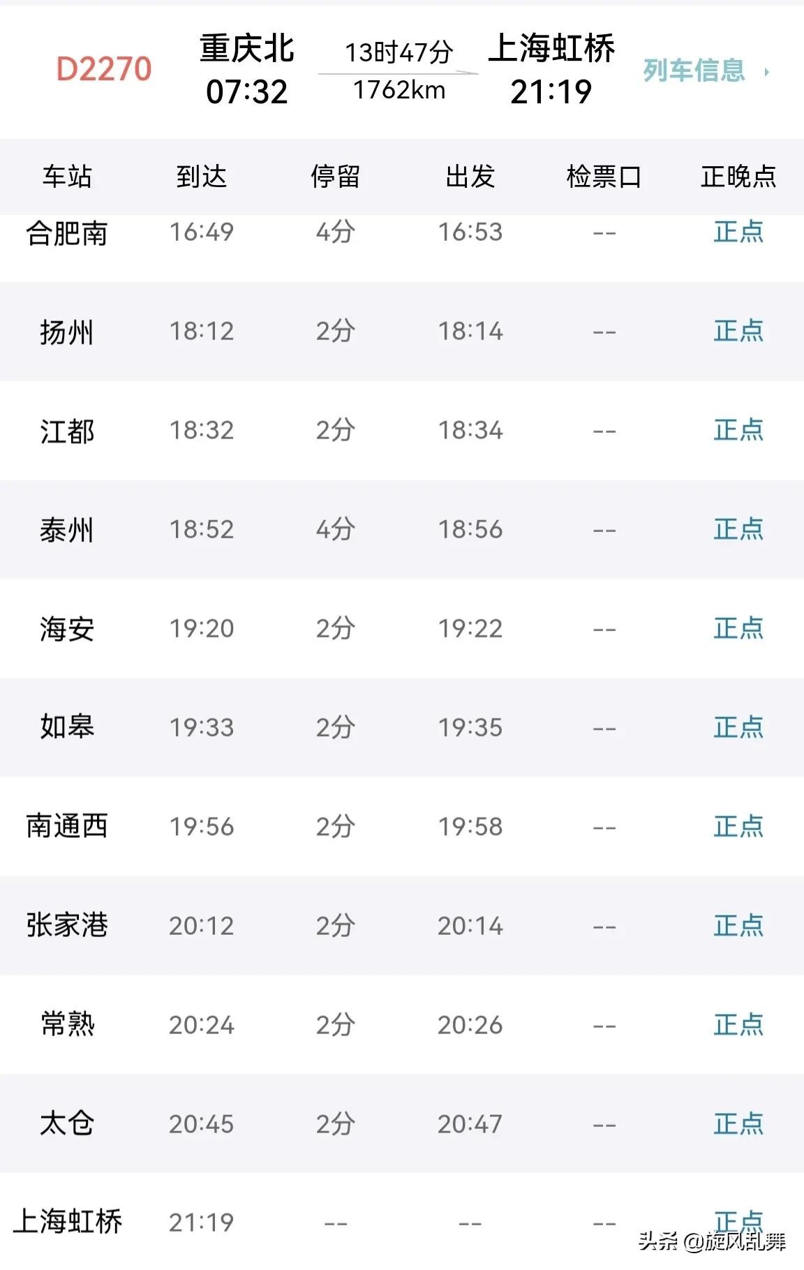 重庆北开往南通D2270/67次列车,延长到上海虹桥站,增加停靠扬州、江都、南通西(19:56~19:58)、张家港、常熟、太仓,减去南通站。
