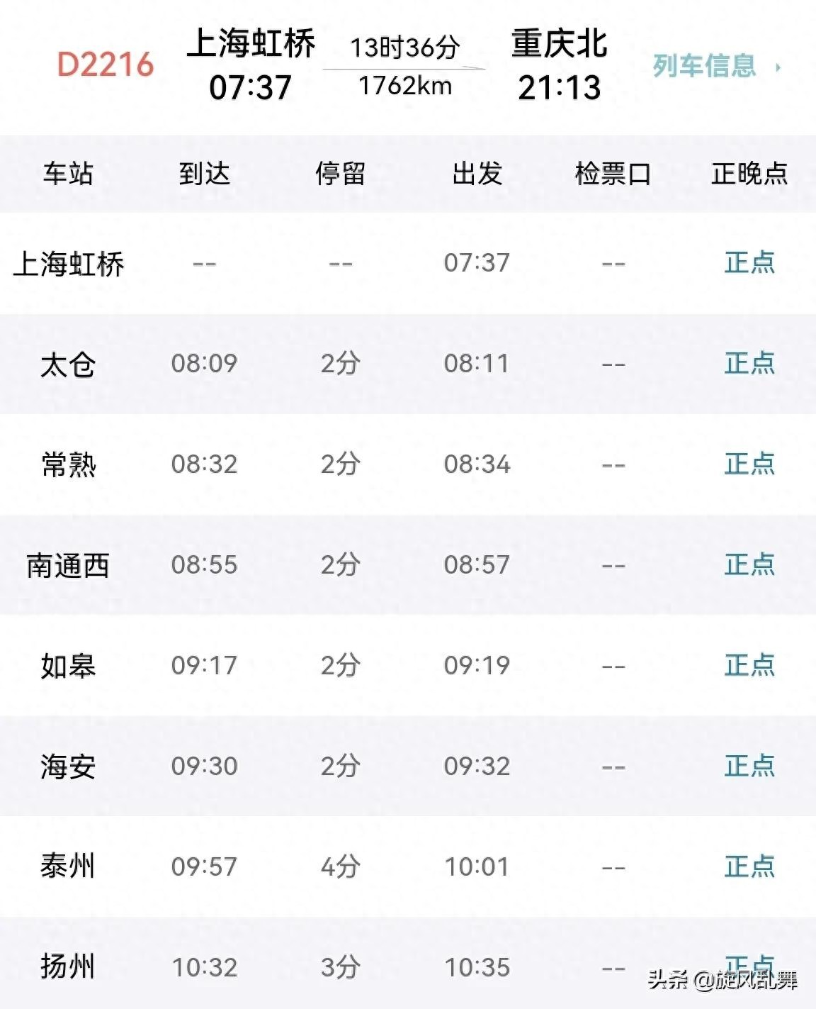 上海虹桥开往重庆北的D2216次列车,增加停靠南通西站(08:55~08:57)。