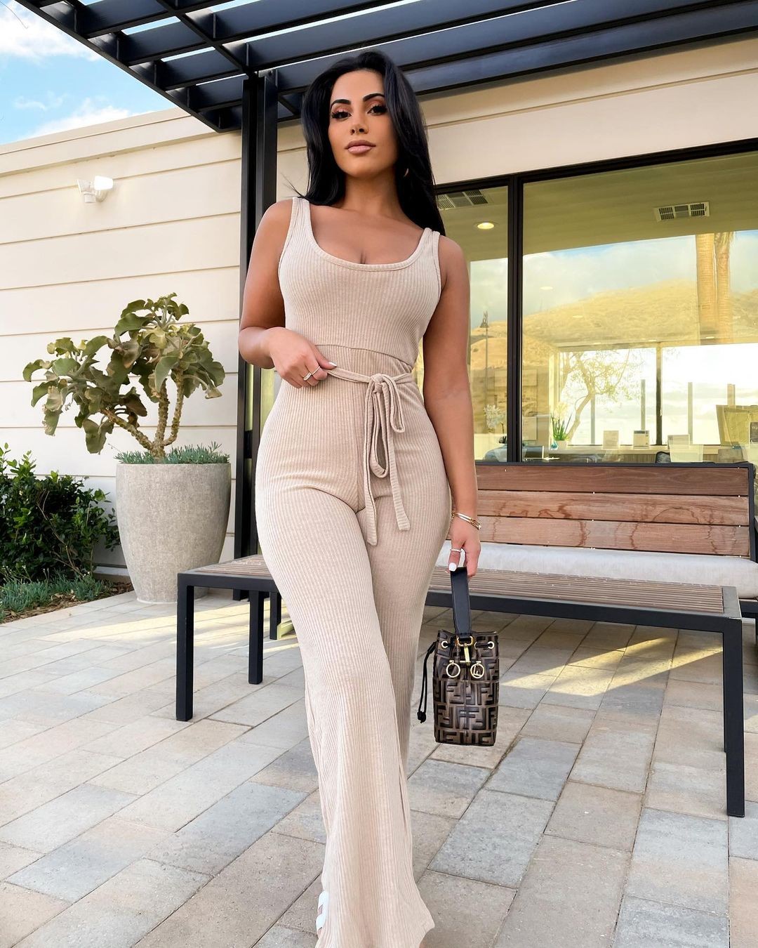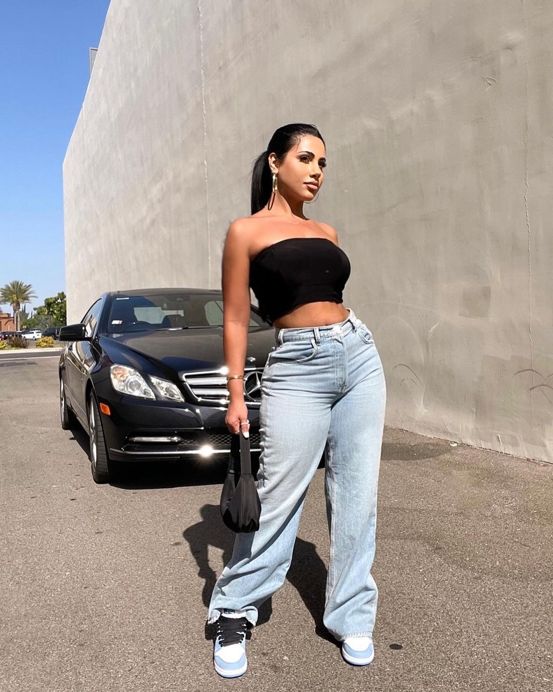 照片中,亚斯敏·卡瓦里(Yasmin Kavari)扎着马尾辫子,将她那带有欧美风格的立体五官毫无遗漏地展现出来。一件黑色的抹胸上衣跟一条浅蓝色的牛仔长裤,跟她比例协调的好身材完美地贴合,实现了最美的衬托。她提着一个黑色的包包,加上今天的发型,有着几分职业女性的精明干练之美。