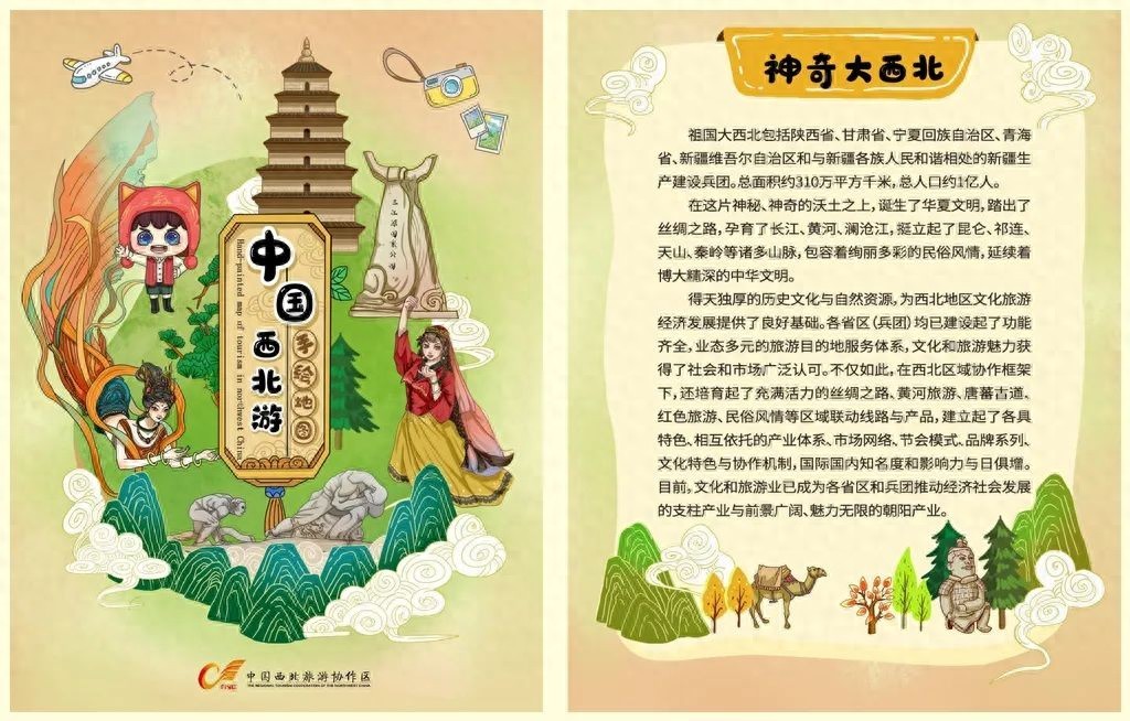 金秋时节,我国大区域旅游协作再现新亮点,同处祖国西北部山水相连的陕西省、甘肃省、青海省、宁夏回族自治区、新疆维吾尔自治区文化和旅游厅、新疆生产建设兵团文化体育广电和旅游局联合推出了《中国西北游手绘地图》,共同向旅游市场展现神奇大西北的旅游魅力。