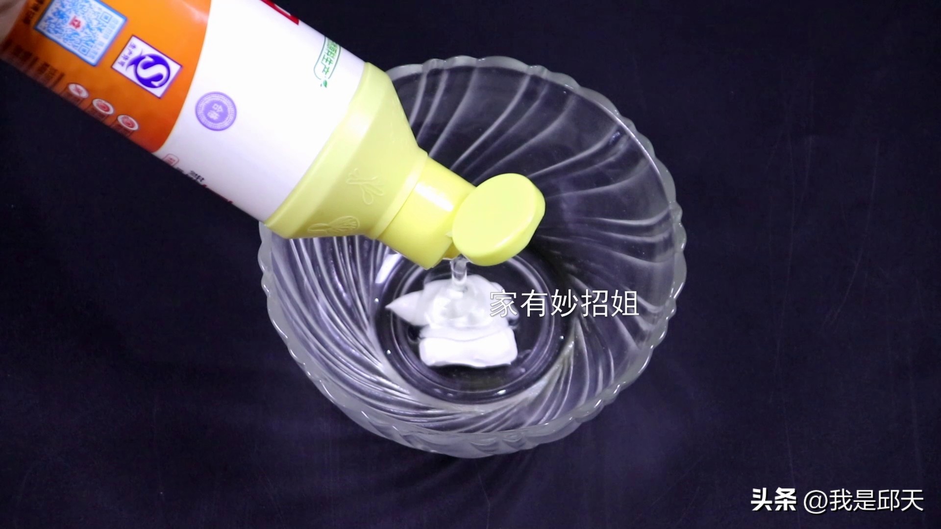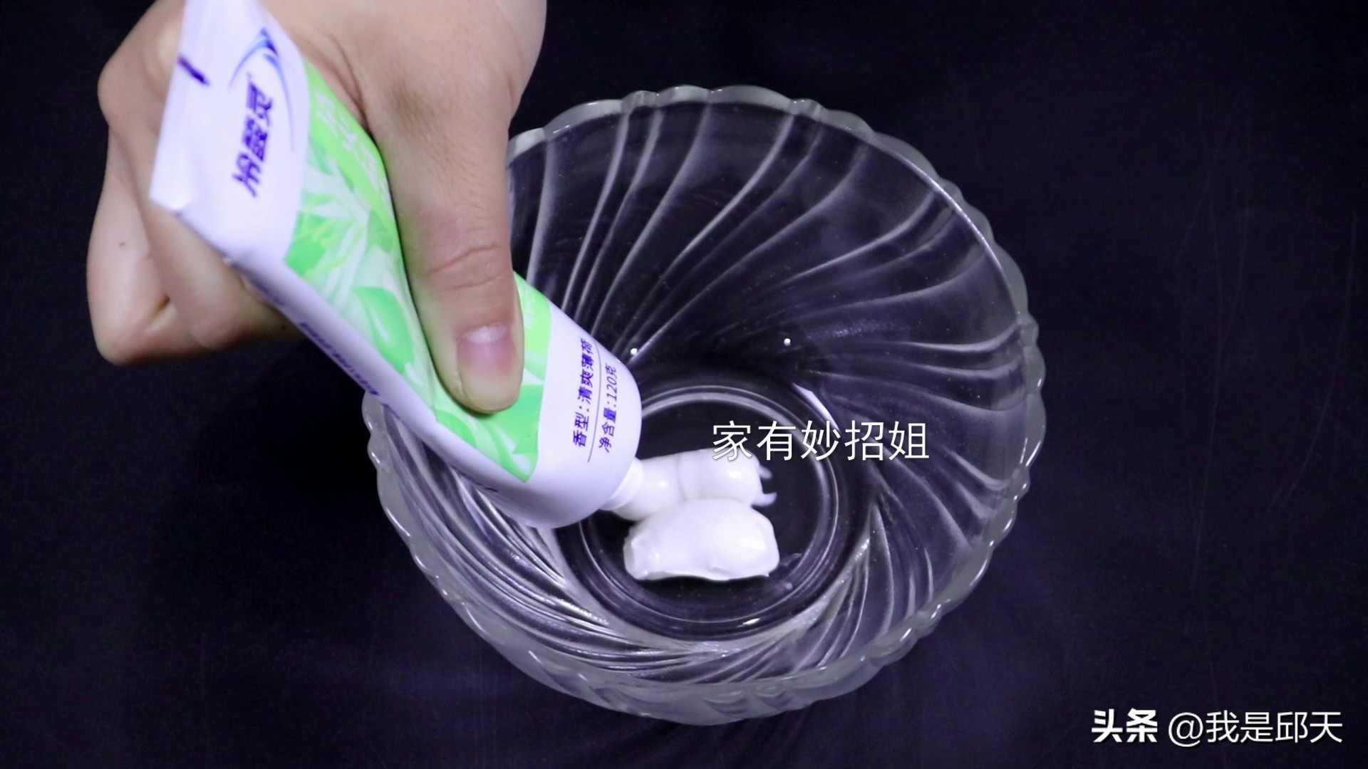 牙膏挤好,我们再往里面挤入洗洁精,洗洁精非常浓稠,可以增加粘性。这个洗洁精的量要比牙膏更多一些。