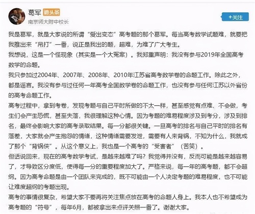 葛大爷此前也说过:“今后再也不想参加高考命题了”。