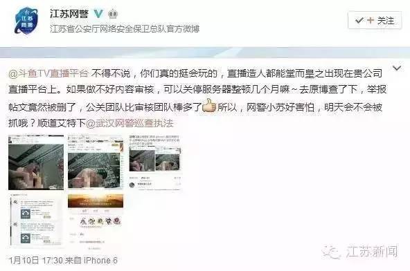 近日,网友爆料称有网络主播竟然在斗鱼TV上公然直播“造娃娃”。视频截图被曝光后,@江苏网警 发文警告斗鱼TV,并@了武汉网警……