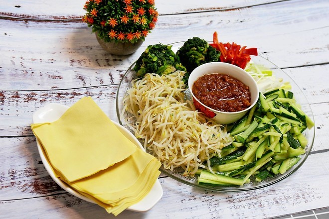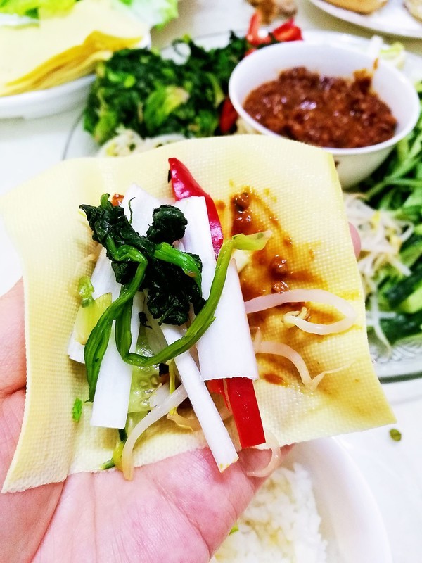 用菜蘸酱吃或者用豆皮抹完酱再卷菜一起吃 简直人间美味啊
