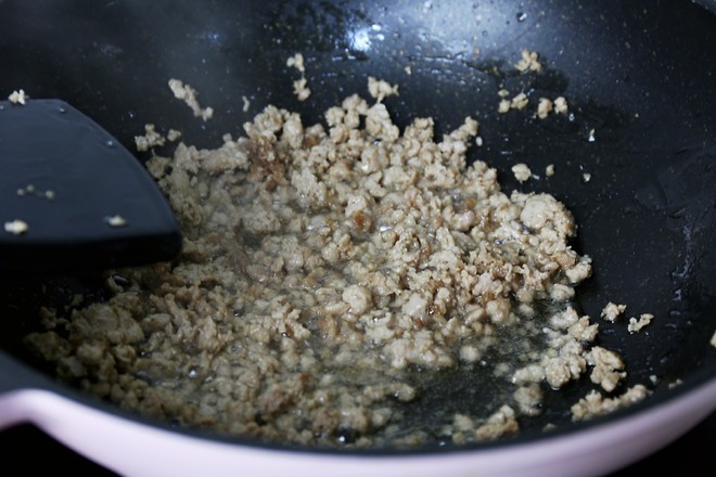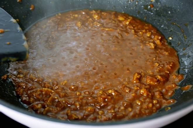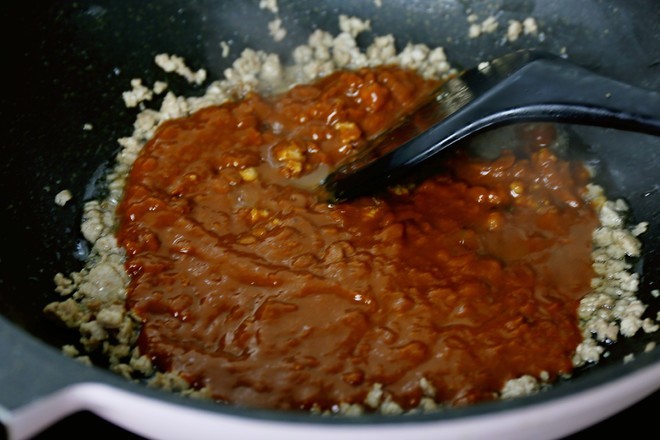 待肉馅炒至微焦时,倒入黄豆酱与肉馅翻炒
