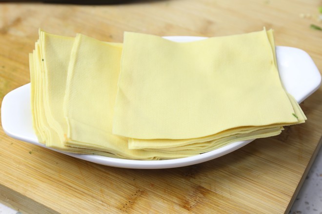 豆皮切成均匀的方块状 不要太小,会卷不下菜