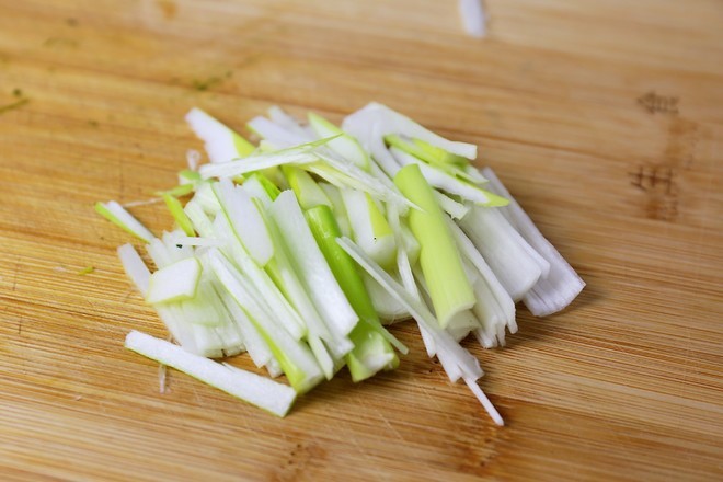 准备配菜,葱切小段再切丝
