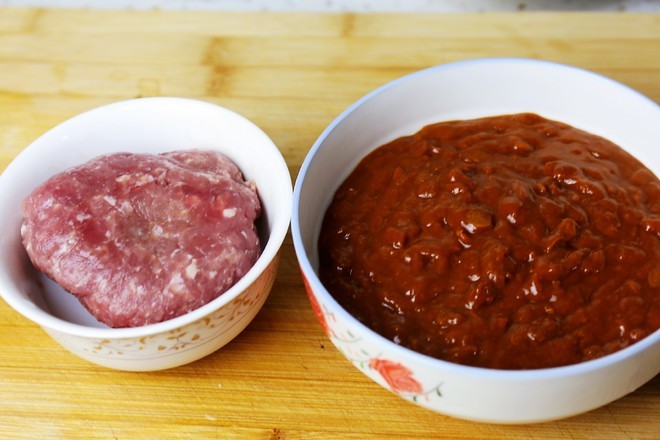 准备好肉馅和黄豆酱,黄豆酱一定别买黑色的那种,不好看也不好吃