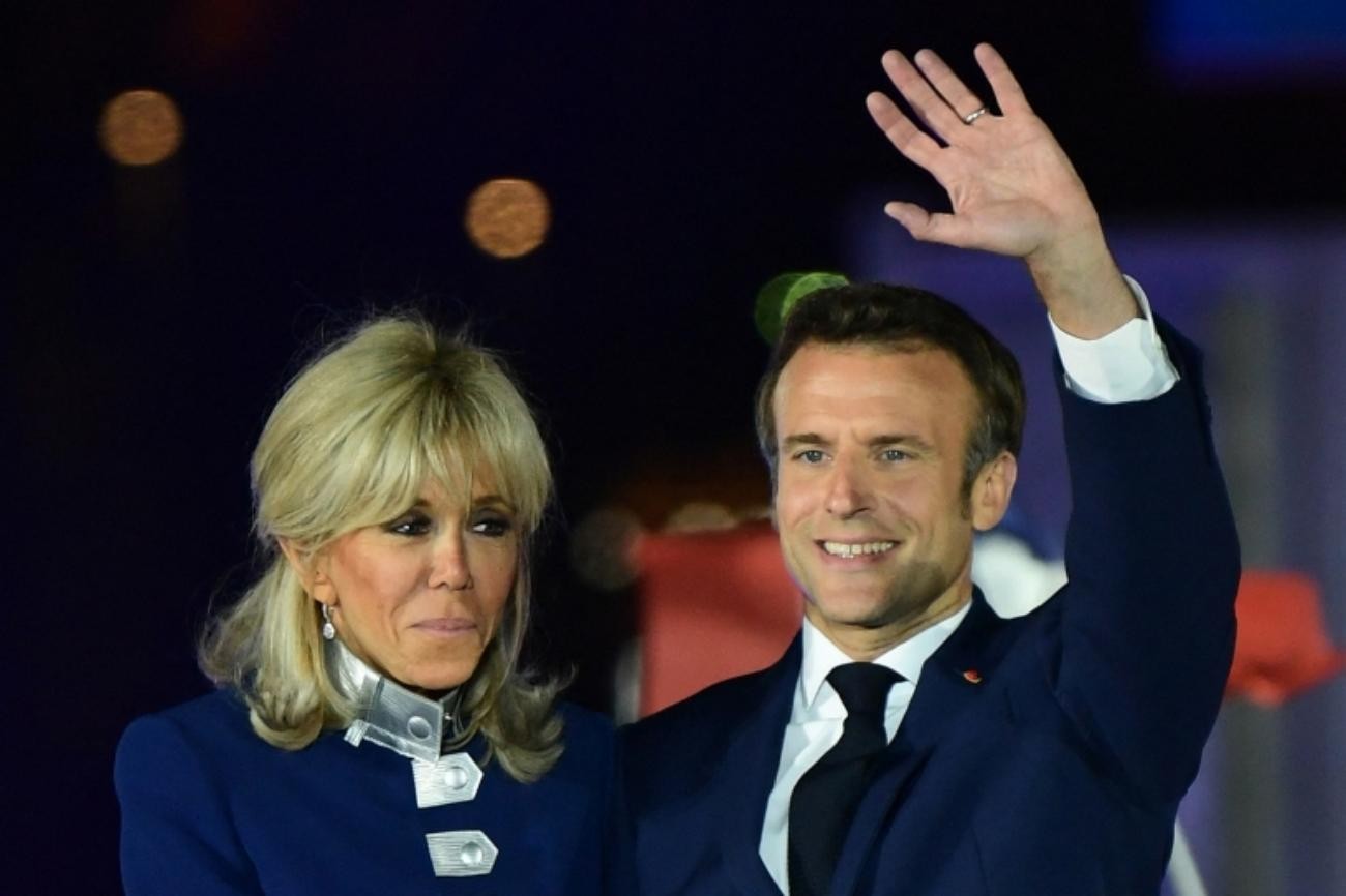 2022年4月24日,马克龙和他妻子布丽吉特在巴黎战神广场庆祝President大选获胜