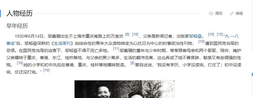 他的父亲是闻名遐迩的新闻界巨擘邹韬奋,也是一位爱国志士和出版先驱,她的母亲则是宋庆龄的挚友,我党优秀的革命家沈粹缜。