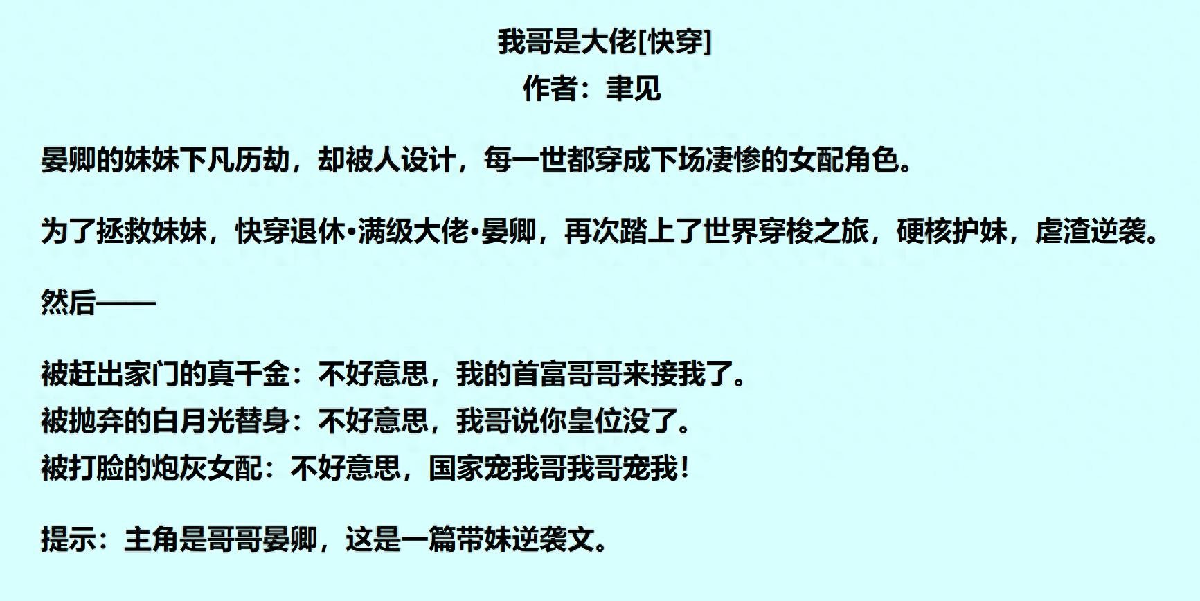 主线都是保护妹妹,帮妹妹打脸逆袭的剧情。国欠哥啊!