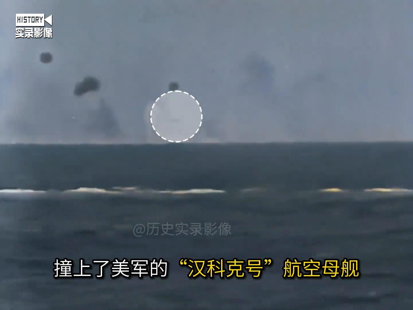 画面中注意到一架日军战机沿着海面低空急速飞行,美军摄影记者似乎预感到这架战机的意图,用镜头紧紧跟追。果然这架神风战机在被击中后拖着长长的火焰撞上了美军的"汉科克号"航空母舰。