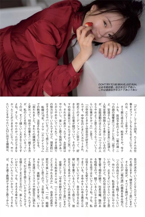 虽说已经37岁,但看松本真理香的写真,能感受到的还是满满的年轻和胶原蛋白,当然也有可能是化妆的缘故。也许这也是亚洲人的优势,对比老外的早熟。